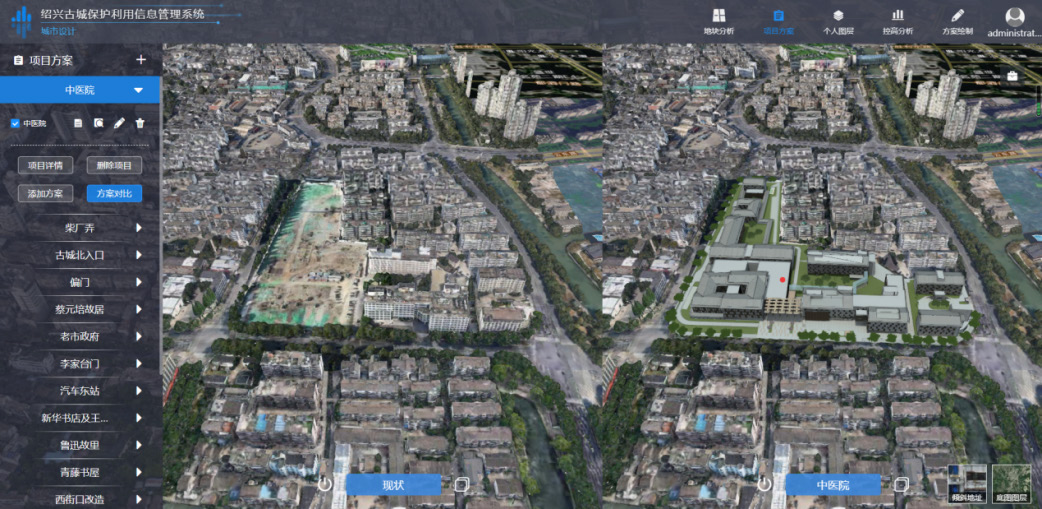 城市设计规划管理。将绍兴古城控规等规划编制数据叠加在实景中,支持古城建设项目方案辅助选址、设计和审批,在实景中进行选址模拟与分析,对方案数据进行管理、查询、展示,可多窗口进行项目的多方案同屏幕比对。此外,能在同一屏幕中对不同方案进行调整、比较,辅助决策者更直观地比较出各方案的优缺点,选择出更佳方案。