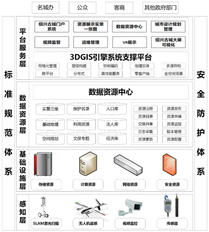 在数字化、网络化、智能化深入发展的背景下,智慧城市建设已是推动城市创新发展和城市文化遗产保护的重要动力。联合国人居署中国未来城市顾问委员会《未来城市顾问展望2024:数字城市治理》指出,数字技术正在深刻重塑城市治理模式。绍兴是全国首批历史文化名城,有着2500 年的建城史,城乡历史文化遗产丰富,且与城市更新区域高度重叠。绍兴着力探索“全方位数据普查建库—保护信息平台建设—长效更新运维机制建立”实施路线,建立绍兴古城保护利用信息管理系统,创新采用多模态数据快速高效采集、时空语义信息关联解析和海量实景三维数据智能化管理等技术,实现新型数字孪生技术下的古城保护利用研究,助力绍兴古城在全域数字化保护、文商旅融合服务、城市更新项目风貌管控以及智慧监管等多方面取得显著成效。 总体设计 构建古城保护全要素资源中枢。构建畅通的信息流转载体和机制,高度集成市区两级、各部门的业务数据。通过统一存储、归集、处理、分析信息,实现资源的统一调度和动态管控。此外,梳理各方权责和业务管理需求,整合标准化的工作流程,实现了信息总控和精细化管理。 打造古城信息共享与联动管理平台。建立信息共享和高效协同的机制,制定标准化的数据接口、数据格式和模型类型。通过打通数据交互的壁垒,基于角色的用户权限控制,实现一个平台上多个板块的联动管理,从而促进古城保护利用信息管理系统的协同调度和运营。 BIM+GIS+AI赋能古城实时监管与预警。利用BIM+GIS的三维可视化特点,基于视频监控和定位融合技术,能实时反映古城交通、人流和安全情况。结合AI智能分析算法和预警提示,辅助政府各部门对古城的科学管理。 系统框架 绍兴古城保护利用信息管理系统总体技术框架图 基于绍兴市政务网,建设绍兴古城保护利用信息管理系统,系统架构包括标准规范体系、安全防护体系、感知层、基础设施层、数据资源层和平台服务层。标准规范体系分为数据类、生产类和运行管理类,作为古城数据汇集、数据资源中心建立、数据应用、服务合理利用的重要依据;安全防护体系包括安全技术与管理体系,严格遵循国家等级保护有关规定,建立信息系统综合防护体系;感知层负责古城数据资源的采集和识别,包括无人机遥感、SLAM激光扫描、视频监控、水质/大气/古建监测等物联采集设备;基础设施层提供部署、运行所需的软硬件设施和环境,包括存储、计算、网络和安全资源;数据资源层是核心组成部分,统一管理古城实景三维、基础地理、保护名录、空间规划、利用资源、文保专题以及人口经济等数据资源,并提供数据资源注册、发布、申请、交换、监控、更新等服务;平台服务层以3DGIS(三维地理信息系统)引擎系统提供的实景三维服务能力为基础,构建古城门户、大屏可视化、城市设计规划等顶层应用,为政府部门、古城企业、社会公众以及其他关联机构提供丰富的平台服务。 系统功能 ——网页端 古城门户系统界面