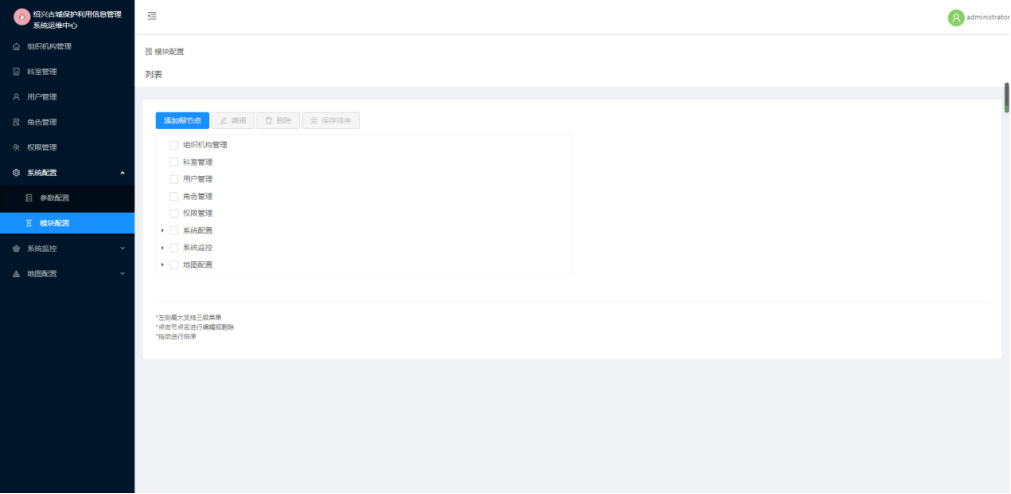 运维管理。保障系统稳定运行,包括组织结构管理、科室管理、用户管理、角色管理、用户角色分配、角色权限分配、日志管理、运行监控、地图配置等。