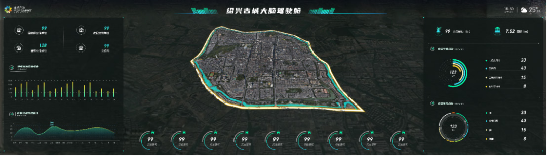 绍兴古城大屏可视化。提供实景三维城市现状、发展历史变迁、大数据等展示功能,实现对绍兴古城资源、文化故事、发展规划等信息提供大屏浏览服务。
