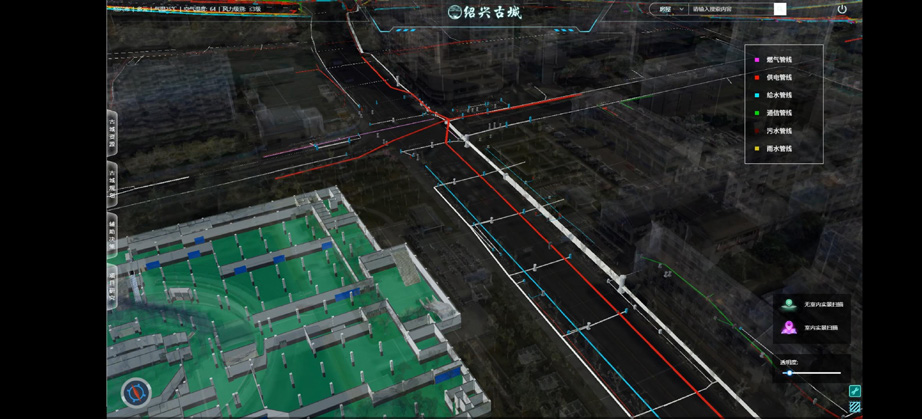 地下管网管控。构建管网仿真三维模型,建设管点模型,融合地下空间各类实景三维模型构建地下管网数字孪生基本盘,直观呈现绍兴古城区域内主干道路地下管线分布,通过实景模拟减少隐蔽工程损害,实现对管线的统一管理和优化控制。