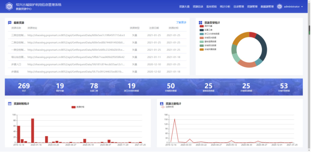 数据资源中心。提供资源大盘展示、资源目录展示、监控巡查、统计分析、目录管理、资源管理、数据源管理等功能,方便用户快捷浏览所需资源,实现对古城数字化模型、基础地理、保护对象、资源利用、规划专题、经济、古城项目、古城产业信息等数据的统一管理、发布、监控和服务共享。